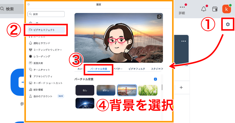 まずは、事前に背景を設定しておく方法です。Zoomアプリを開いて以下の順で操作しましょう。
