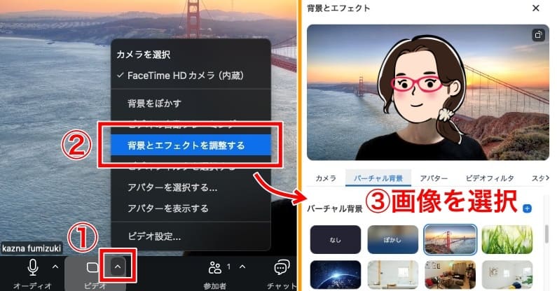 パソコンでミーティング中に背景を設定するには、以下の順で操作します。