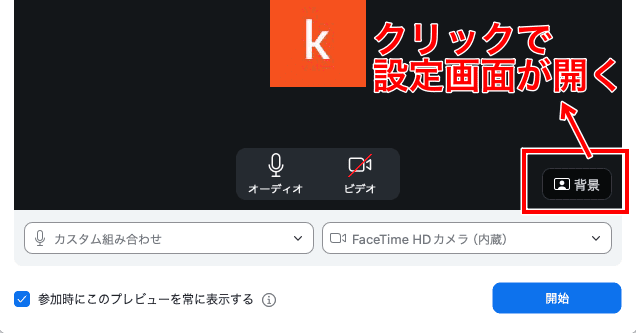 ミーティング開始前の画面から背景を設定するには、入室前の画面で「背景」ボタンをクリックします。すると設定画面が開き、設定・変更が可能です。