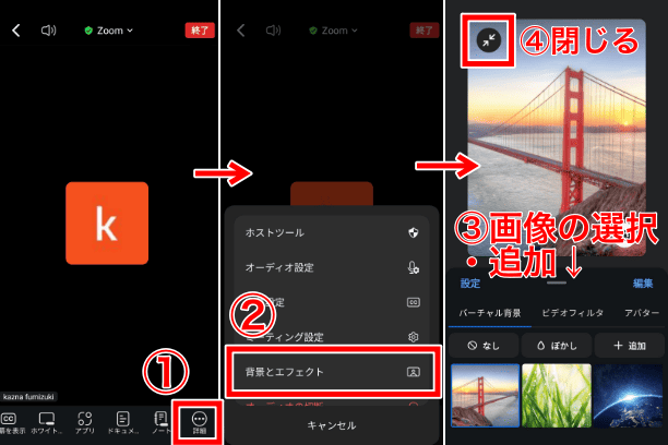 スマートフォンでミーティング中に背景を設定するには、以下の順で操作します。
