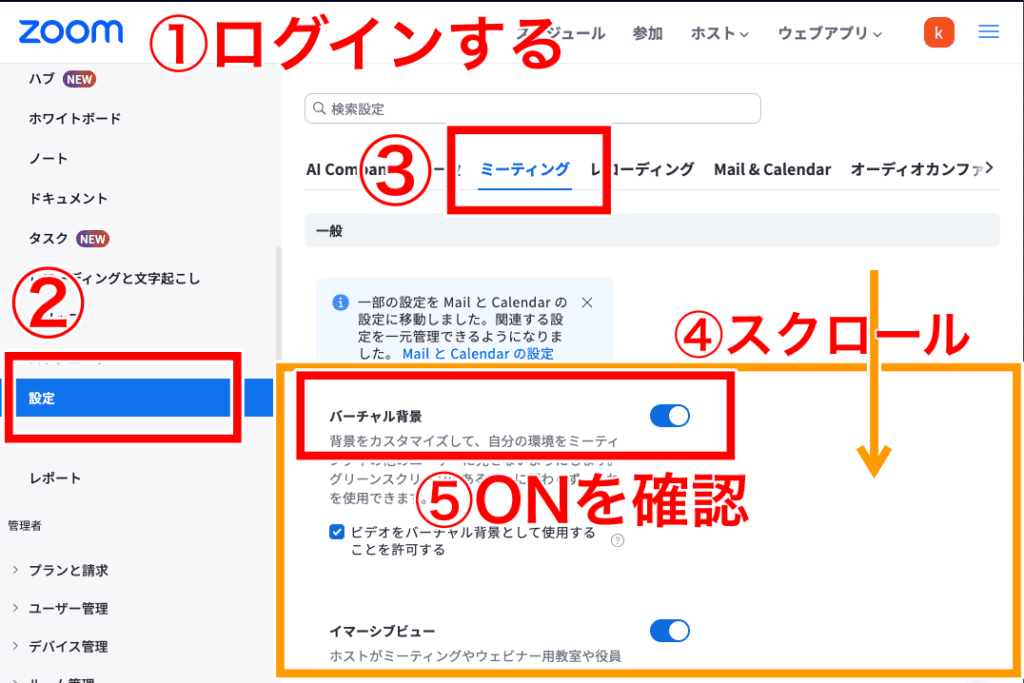 - 「バーチャル背景」を見つけてオンになっているか確認