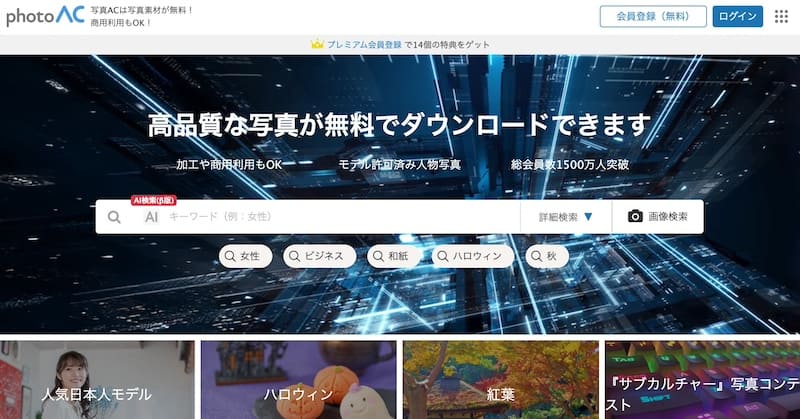 写真ACとイラストACは、オフィスや風景といった国内の素材が豊富なサイトです。会員登録により画像のダウンロードが可能となります。無料会員は、1日の検索回数やダウンロード点数に制限があります。