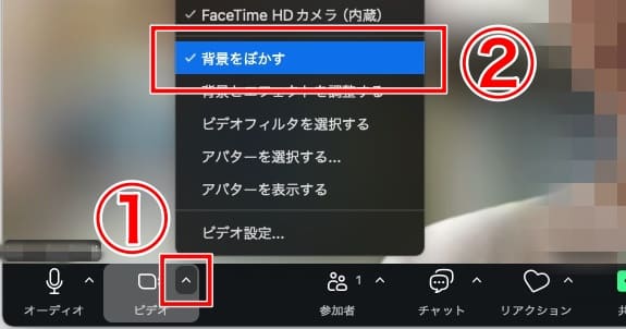 - メニューから「背景をぼかす」をクリックしてチェックを入れる