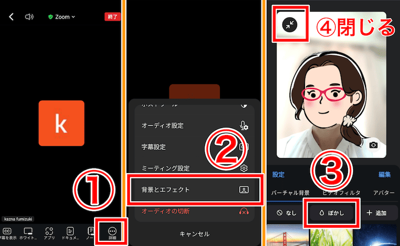 ミーティング開始時に背景ぼかしを設定する手順|スマホ