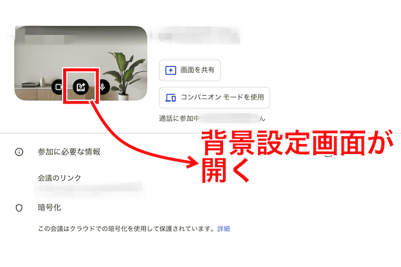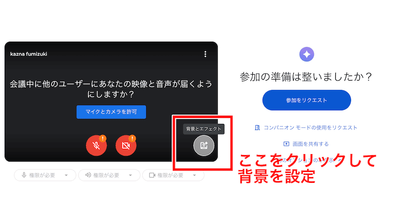 会議のURLにアクセスし、参加する前の画面で背景を設定できます。ビデオ画面の右下にある「背景とエフェクト」アイコンをクリックしてください。