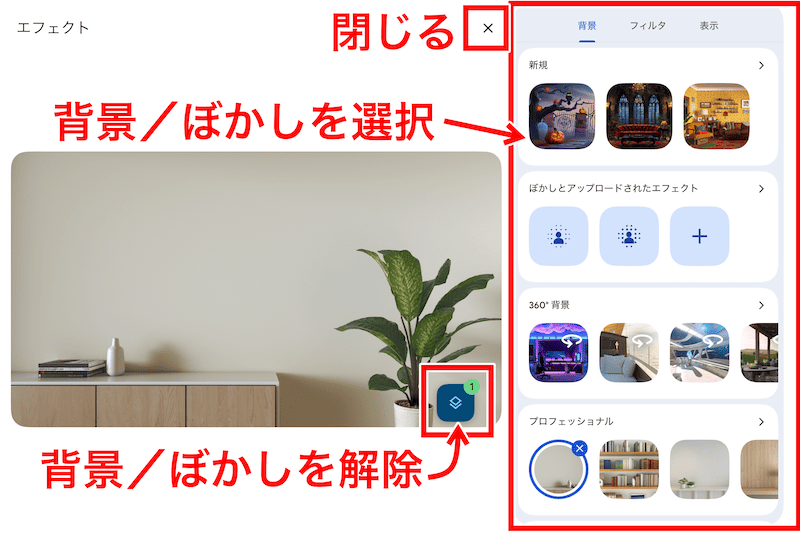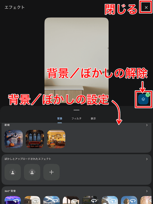 - ぼかしとパーソナル背景:背景をぼかす、オリジナル背景を追加する