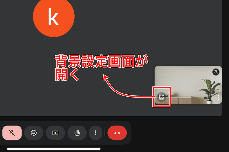 モバイル端末のGoogle Meetアプリを使って会議に参加する場合も、背景を設定できます。ここではiPadの画面で説明します。