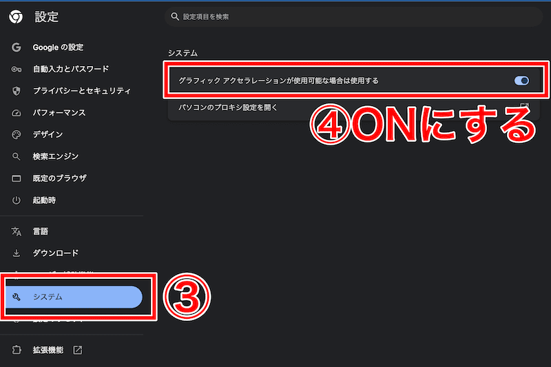 これらの要件を満たしたうえで、「グラフィック アクセラレーション」(ハードウェア アクセラレーション)の設定が有効になっているか確認しましょう。ONにすることで、背景の計算を専用のCPUに任せられるようになり、背景の利用が可能となります。