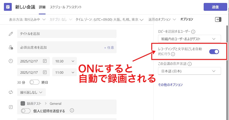なお、組織の設定によっては自動録画が使えない場合もあります。項目が表示されない場合は、管理者に確認してみてください。