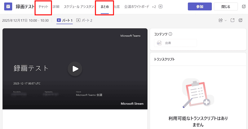 - 会議の詳細画面で「チャット」タブまたは「まとめ」タブを見る