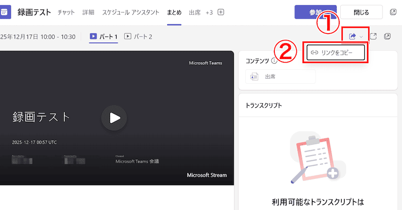 URLはメールやチャットで手軽に共有でき、相手はTeamsアプリやブラウザ上で閲覧可能です。共有したい録画データの「共有」アイコンをクリックするとURLをコピーできます。以下は会議の「まとめ」タブの例です。