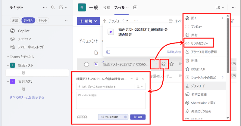 Teamsで録画した会議データを共有する方法は、以下の2通りです。
