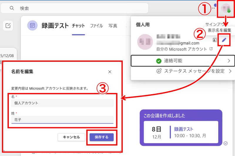 なお、表示名を変更すると、Microsoftアカウント全体に反映されます。社内チャットやチーム一覧といったTeams全体にも反映されるため、変更内容によっては、事前にチームメンバーへ一言伝えておくと混乱を防げるでしょう。