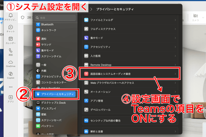 また、Macから会議に参加する場合は、OS側で画面収録を許可していないと、画面共有自体ができません。会議前に、以下の手順で設定を確認しておきましょう。