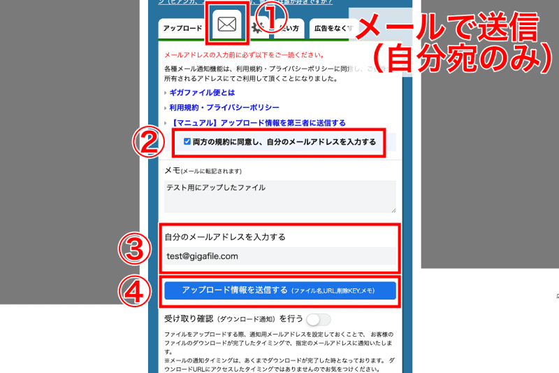 あるいはファイルをアップロードした後に、メールのタブからメールアドレスを入力して、控えを送信しましょう。ただし、このメールアドレスも毎回入力する必要があり、自動送信には対応していません。