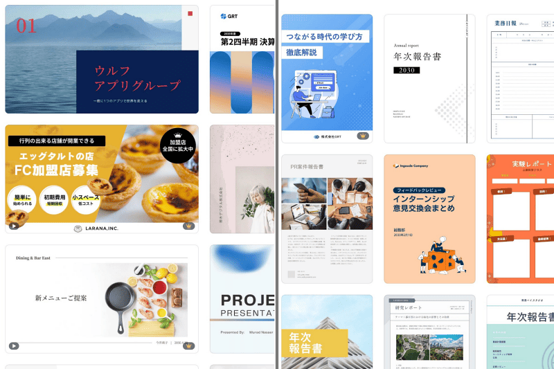 会社の企画書や社内資料、大学での発表やレポートなど、スライドや資料の作成にCanvaを活用できます。豊富なテンプレートから選ぶだけで、デザイン性の高いスライドや資料が完成します。