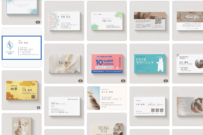 ビジネス用の名刺や、就職活動・個人活動用の名刺も作成可能です。デザインのバリエーションも豊富なため、自分の個性や業種に合った名刺を作ることができます。両面デザインにも対応しています。