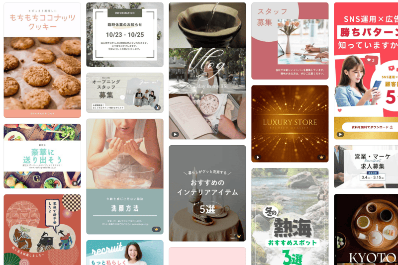 動画編集機能もあるため、Instagramリールなどの動画コンテンツの作成も可能です。動きのあるイラスト素材や、動画素材も豊富に用意されており、コンテンツ作りに活用できます。