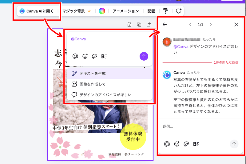 以下はAIにデザインの相談をした例です。無料プランではAI機能の種類や回数に制限がありますが、まずは使える範囲で体験してみるのがおすすめです。